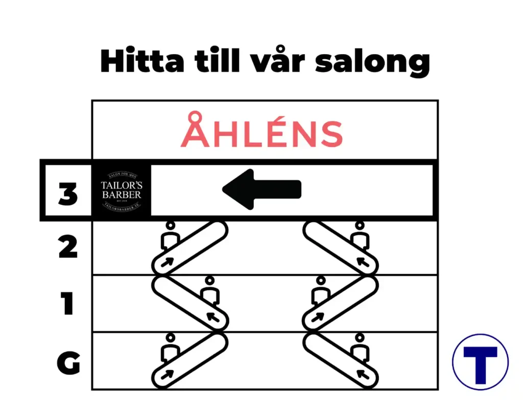 Du hittar oss på tredje våningen, vid väskavdelningen i det sydvästra hörnet av varuhuset. Salongen ligger på herravdelningen – följ skyltarna eller fråga personalen om du behöver hjälp att hitta.